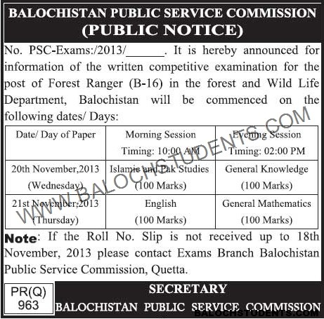 Balochistan Public Service Commission Notice- Forest Ranger Exams
