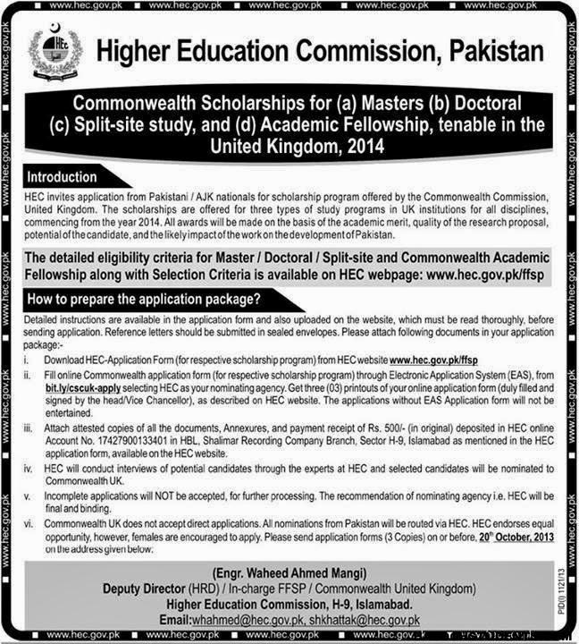 HEC Commonwealth Scholarships Last date: 20th October, 2013 Please read out the above advertisement and you will get all details.