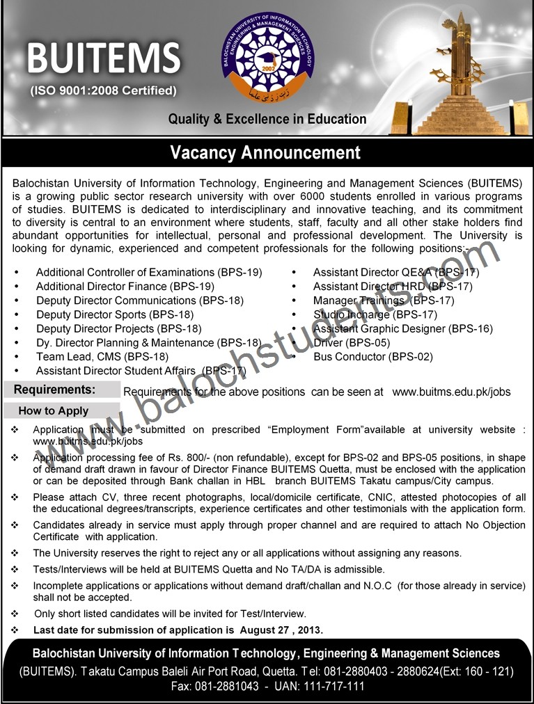 BUITEMS- Balochistan University of Information Technology, Engineering and Management Sciences Jobs