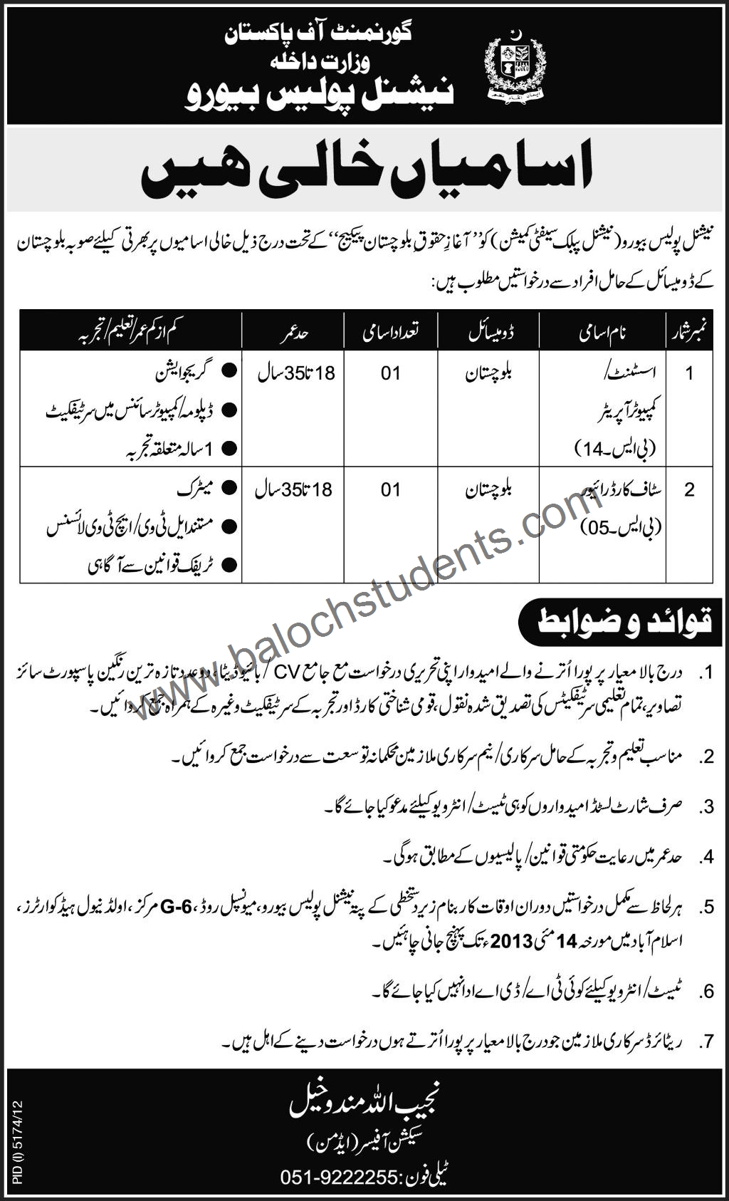 Job Post Vacancy In National Police Bureau For Balochistan Last date: 14th May, 2013 Please read out the above advertisement and you will get all details.